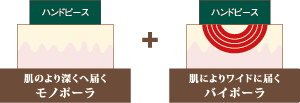 一番の特長は、皮膚の表層近くに熱を伝えるバイポーラRFと、皮膚深部に熱を伝えるモノポーラRFを同時に照射できるところ。