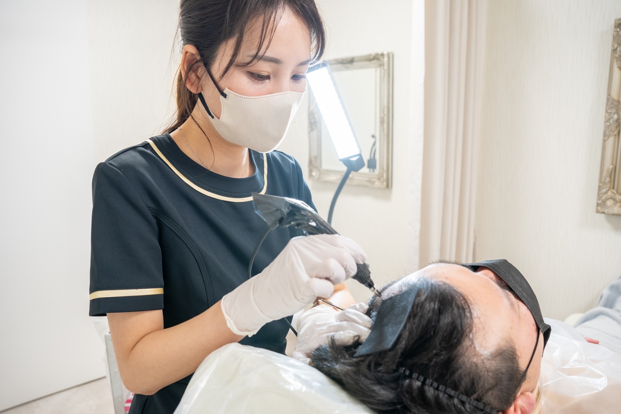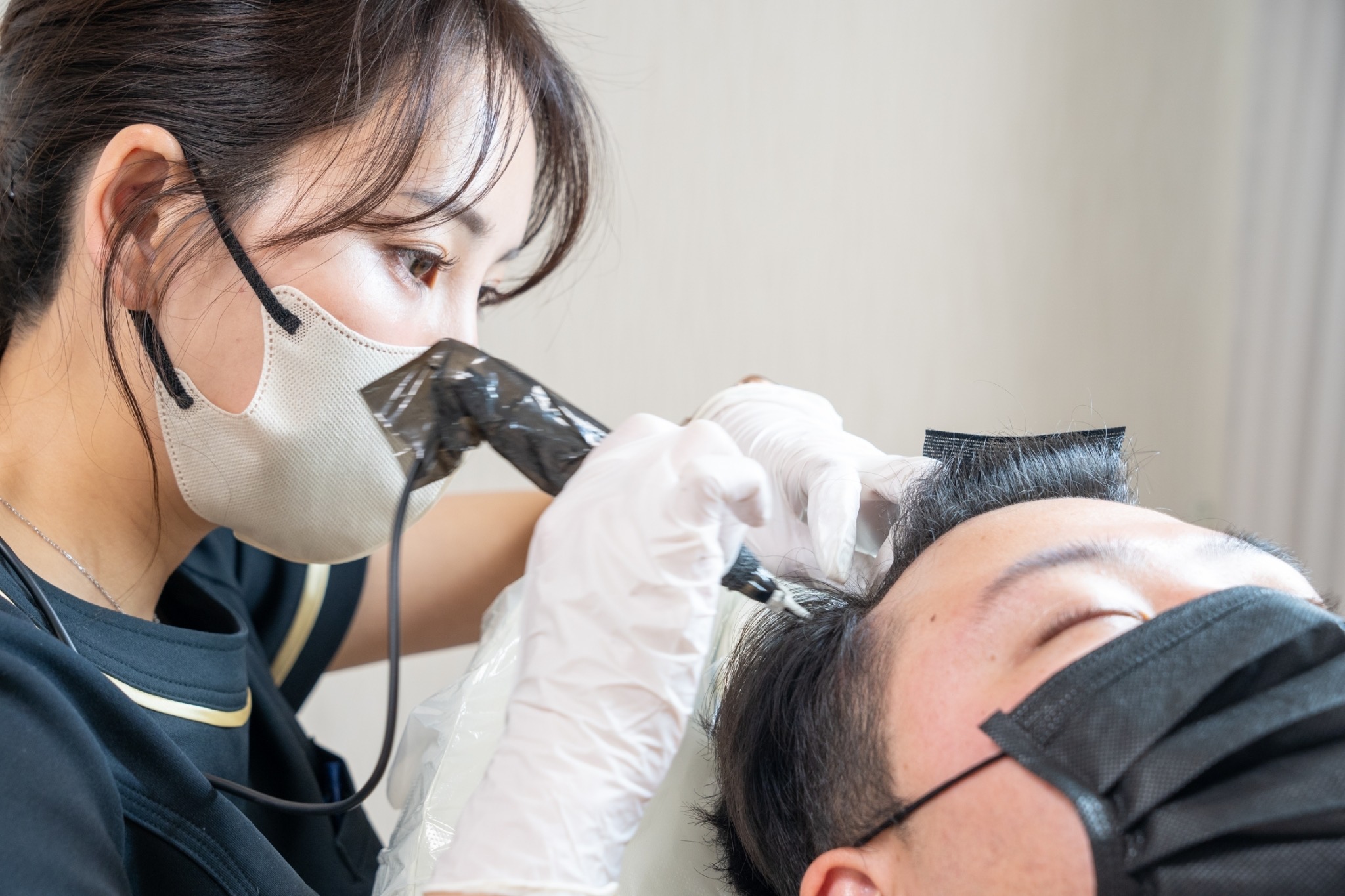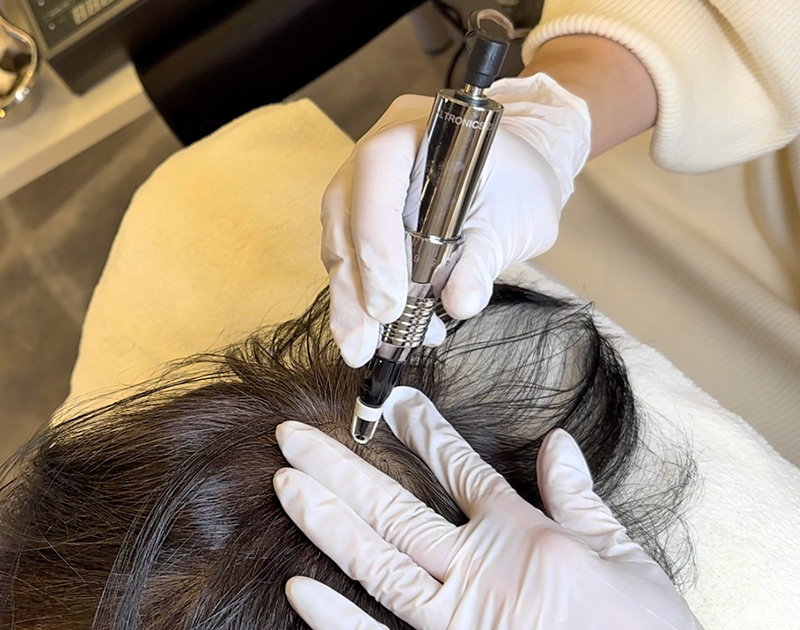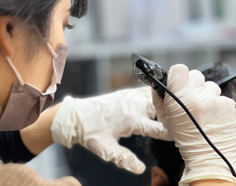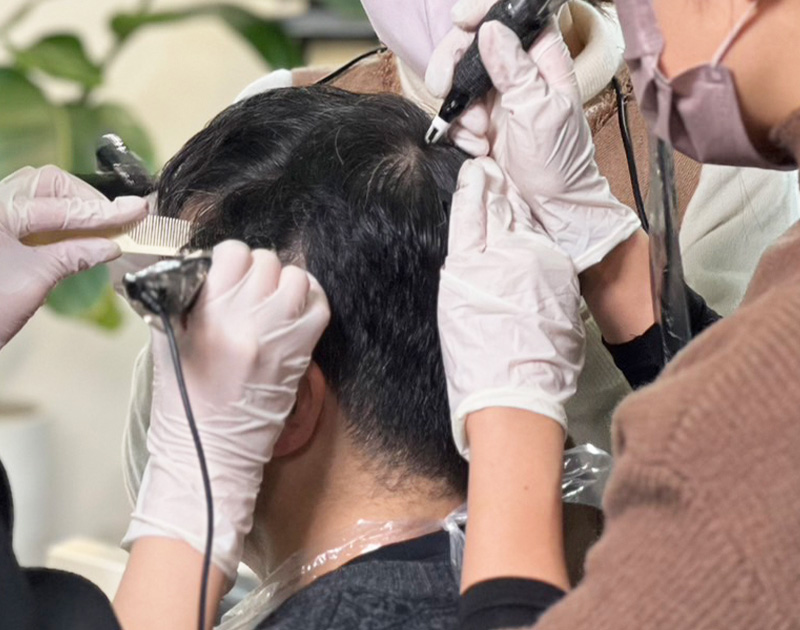 私たちの施術は、専用に開発されたマイクロニードルとプレミアムインクを使用し、頭皮に繊細な色素を注入することによって毛根を精密に再現します。
